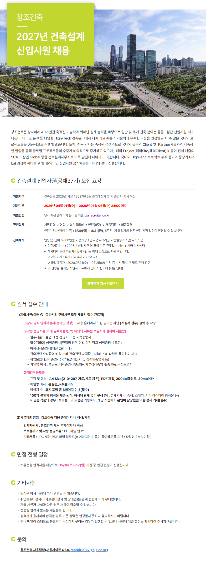 - 서류전형 > 면접 > 실기워크샵 > 인턴(8주) > 채용검진 > 최종합격