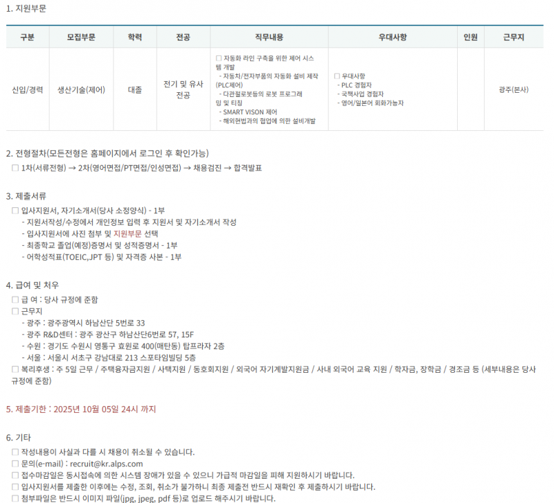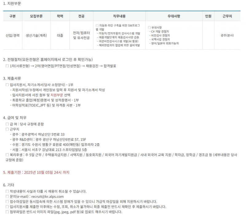 - 지원방법: 채용 홈페이지 온라인 지원(https://recruit.alps.co.kr/Recruit/employList.aspx)