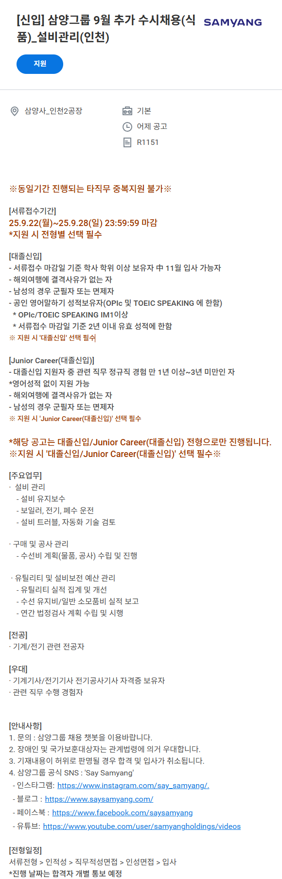 - 지원방법: Samyang Workday Jobs 페이지를 통한 지원(https://samyang.wd3.myworkdayjobs.com/ko-KR/Samyang/job/XMLNAME-----9-------_R1151)