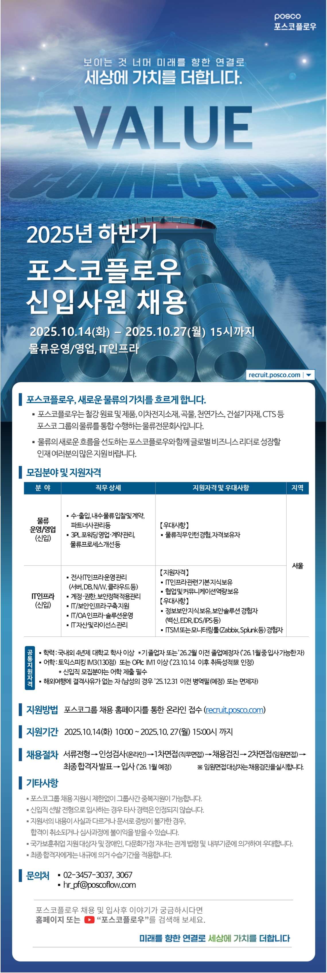 [포스코플로우] 2025년 하반기 포스코플로우 신입사원 채용 (물류운영/영업, IT인프라)