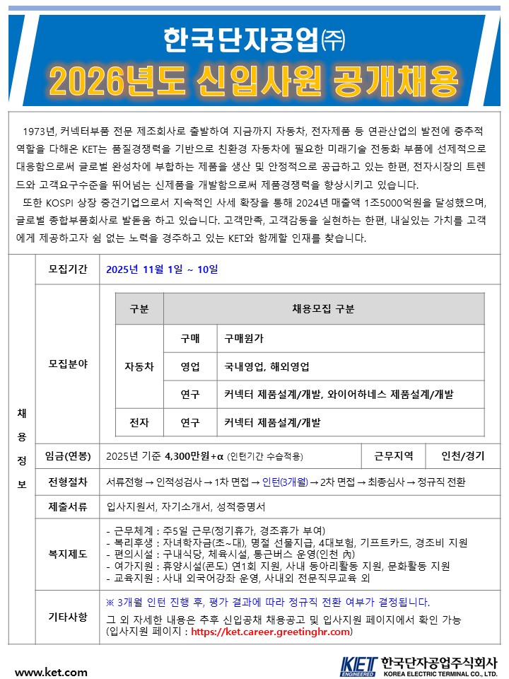 [한국단자공업주식회사(KET)] 2025 신입사원 모집