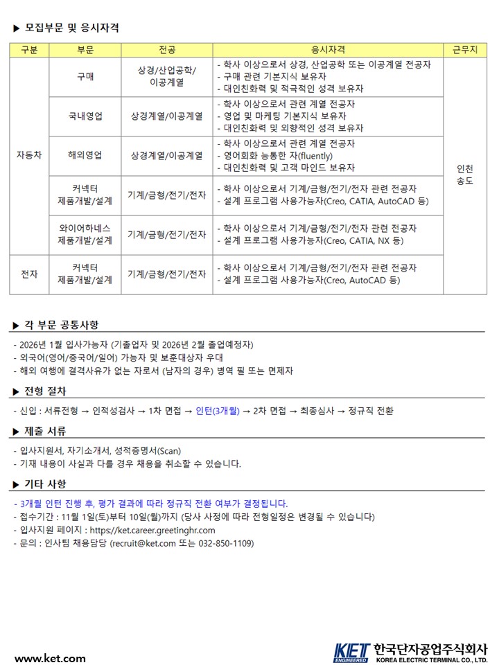 - 지원방법: 온라인 지원 (KET 채용 홈페이지)(https://ket.career.greetinghr.com)