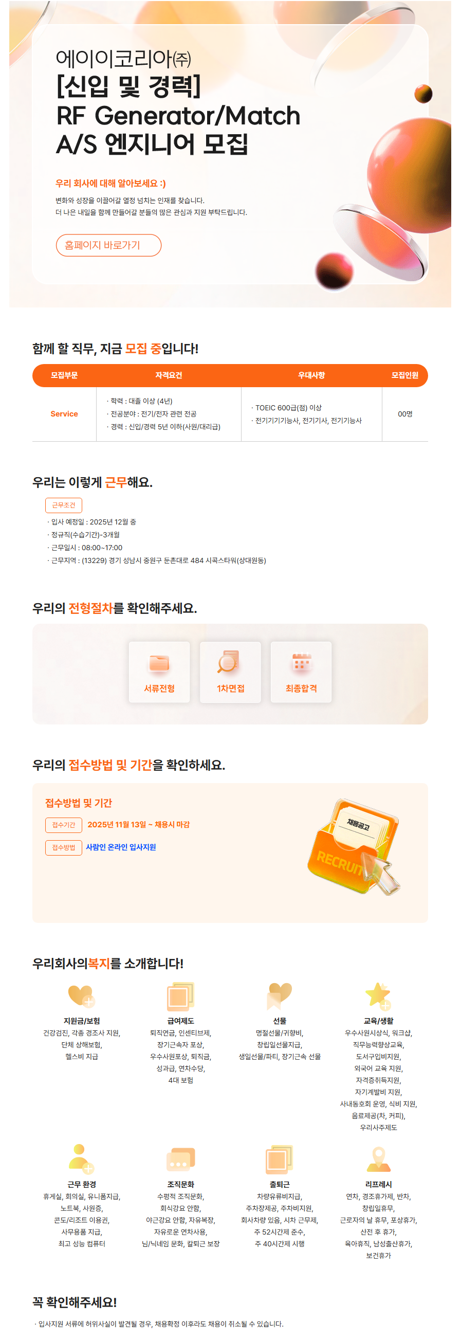 [에이이코리아(주)] [신입 및 경력] RF Generator/Match A/S 엔지니어 모집