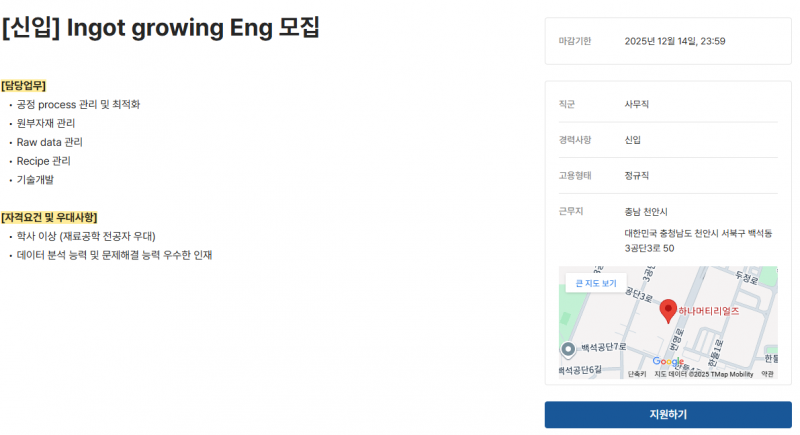 [하나머티리얼즈] [신입] Ingot growing Eng 모집 (천안)