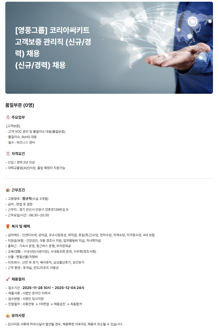 [영풍그룹] 코리아써키트 고객보증 관리직 (신규/경력) 채용