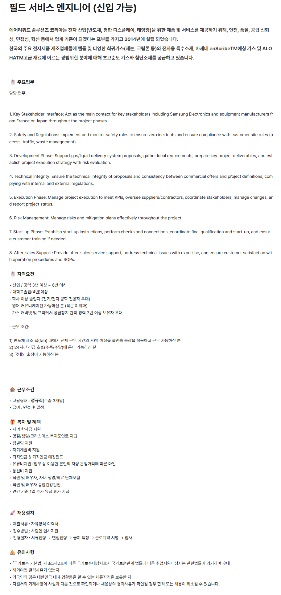 [에어리퀴드솔루션즈코리아] 필드 서비스 엔지니어 신입/경력 채용