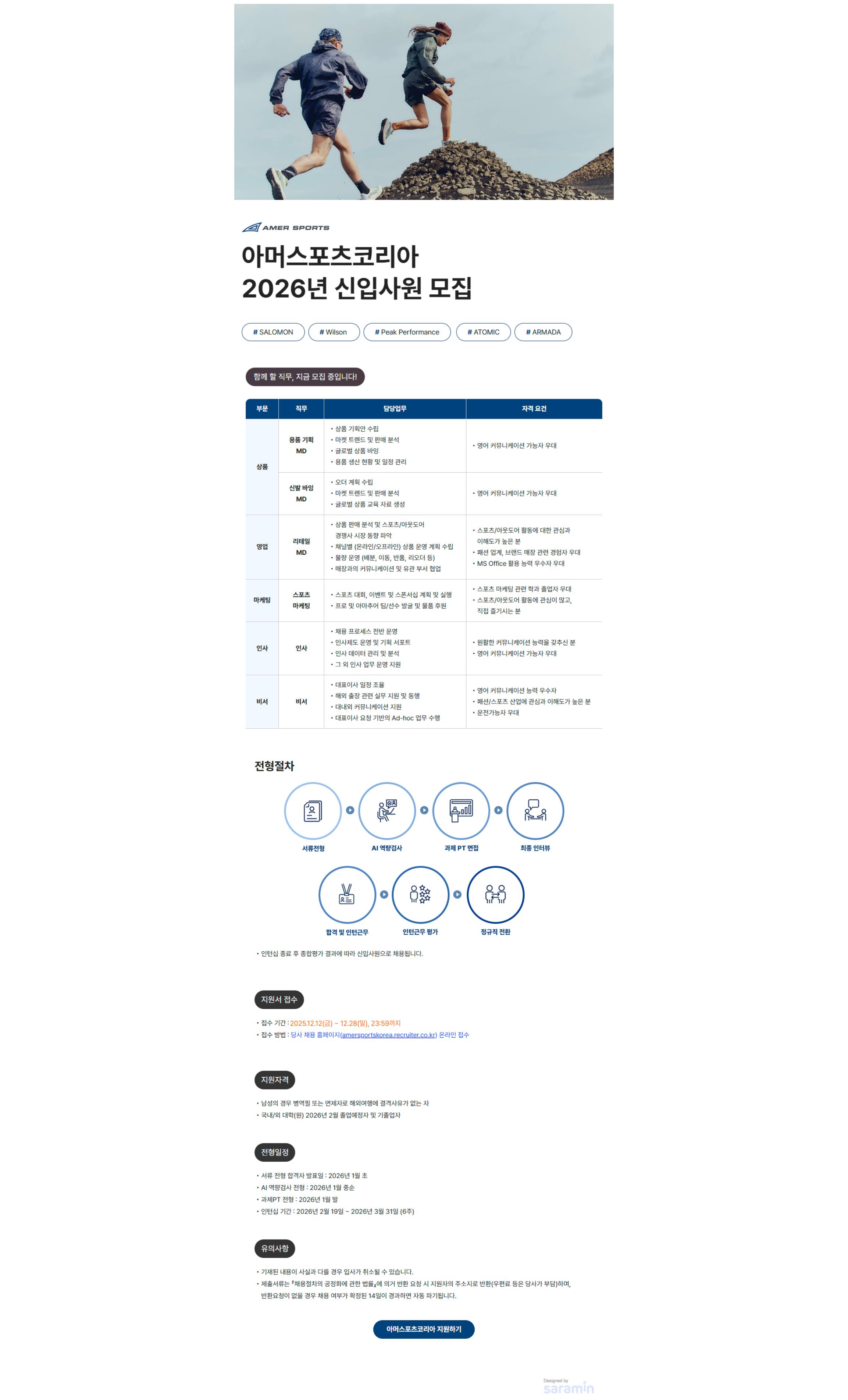 - 지원방법: 채용 홈페이지 온라인 접수(https://amersportskorea.recruiter.co.kr/career/home)