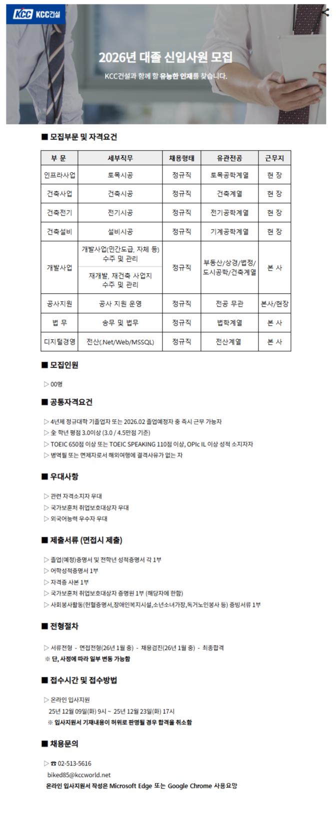 - 지원방법: 홈페이지 입사지원서 제출(https://www.kccworld.net/recruit/people.do)