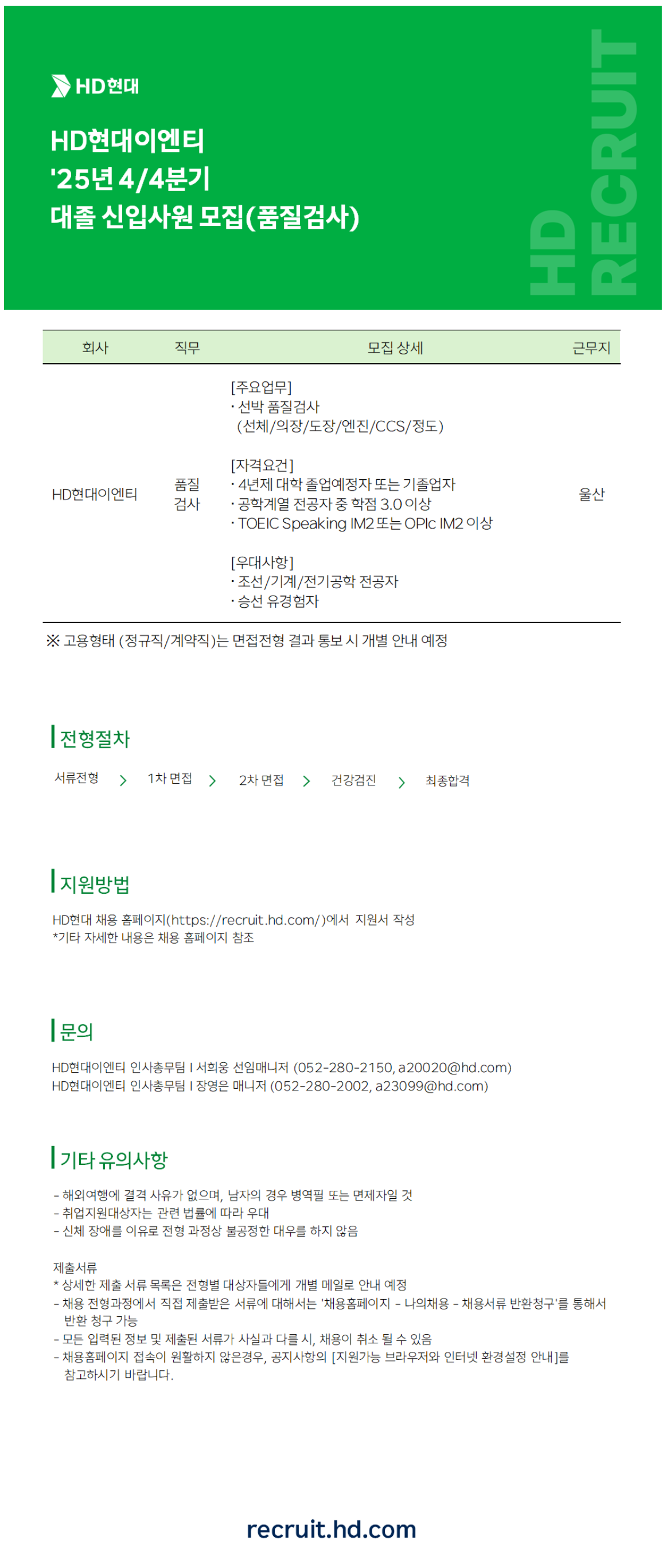 [HD현대이엔티] '25년 4/4분기 대졸 신입사원 모집(품질검사)