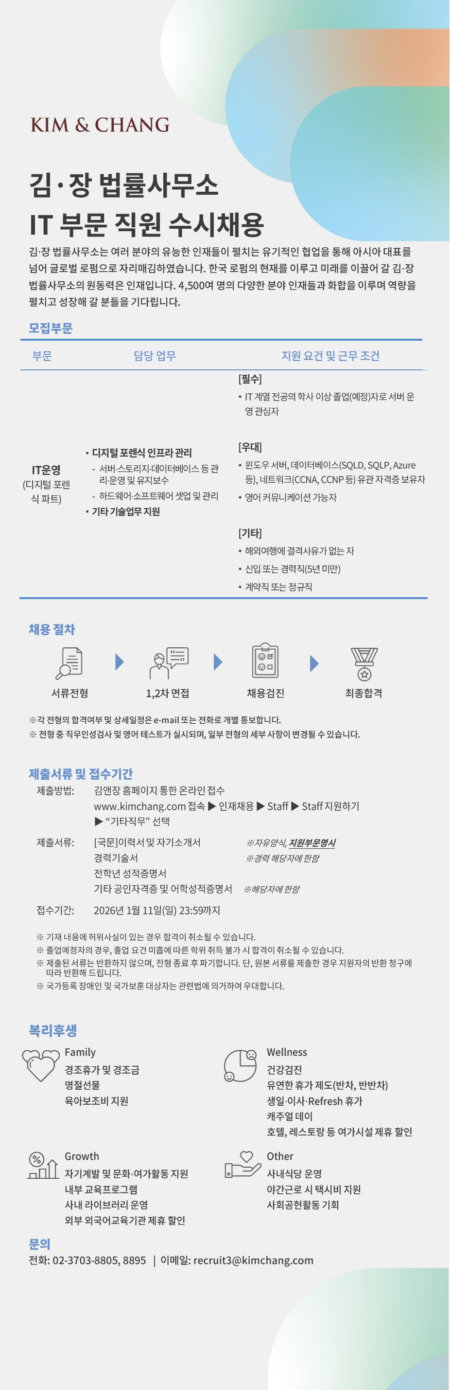 [김·장 법률사무소] IT 부문 직원 수시채용 (IT운영 - 디지털 포렌식 파트)