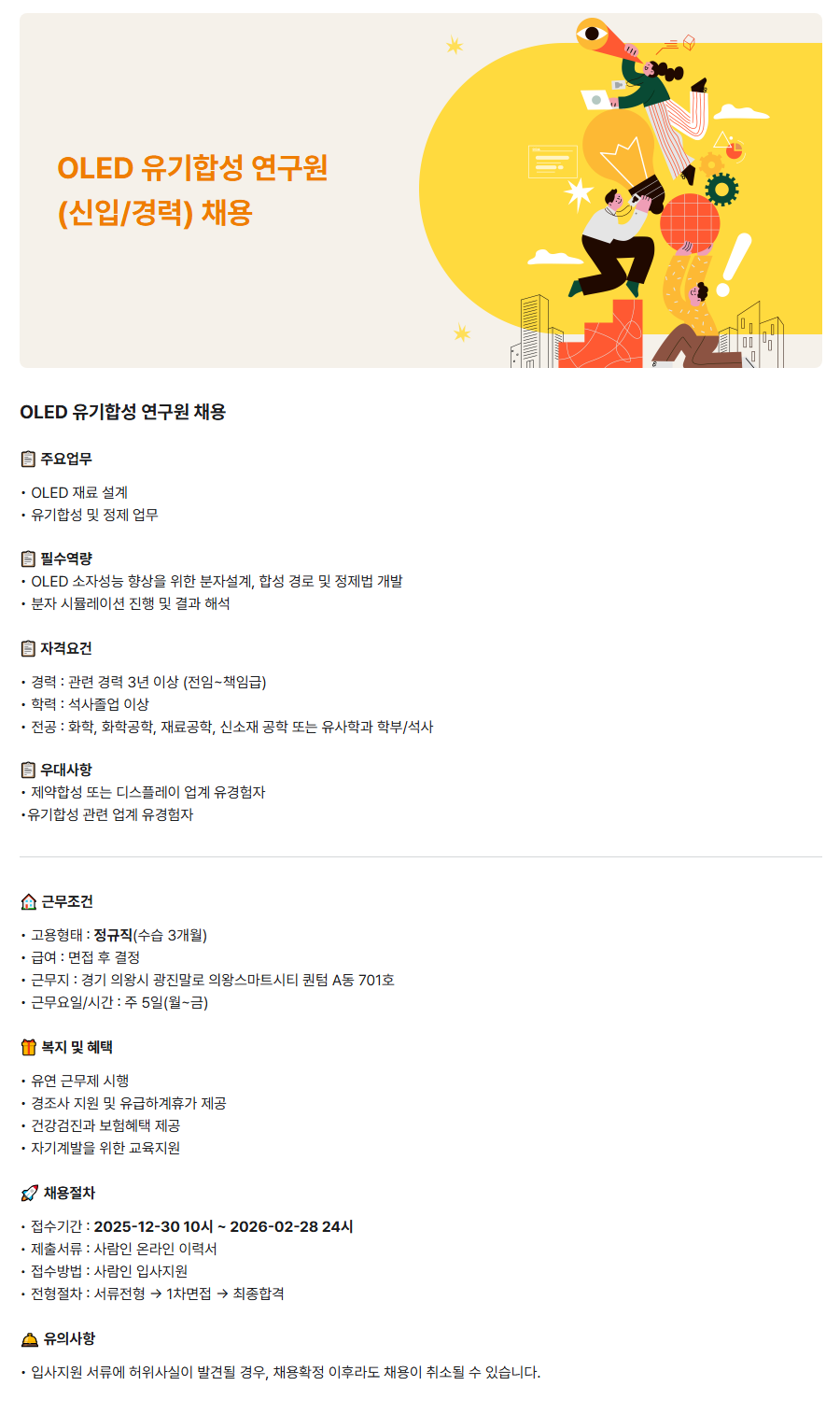 [머티어리얼사이언스] OLED 유기합성 연구원 (신입/경력) 채용