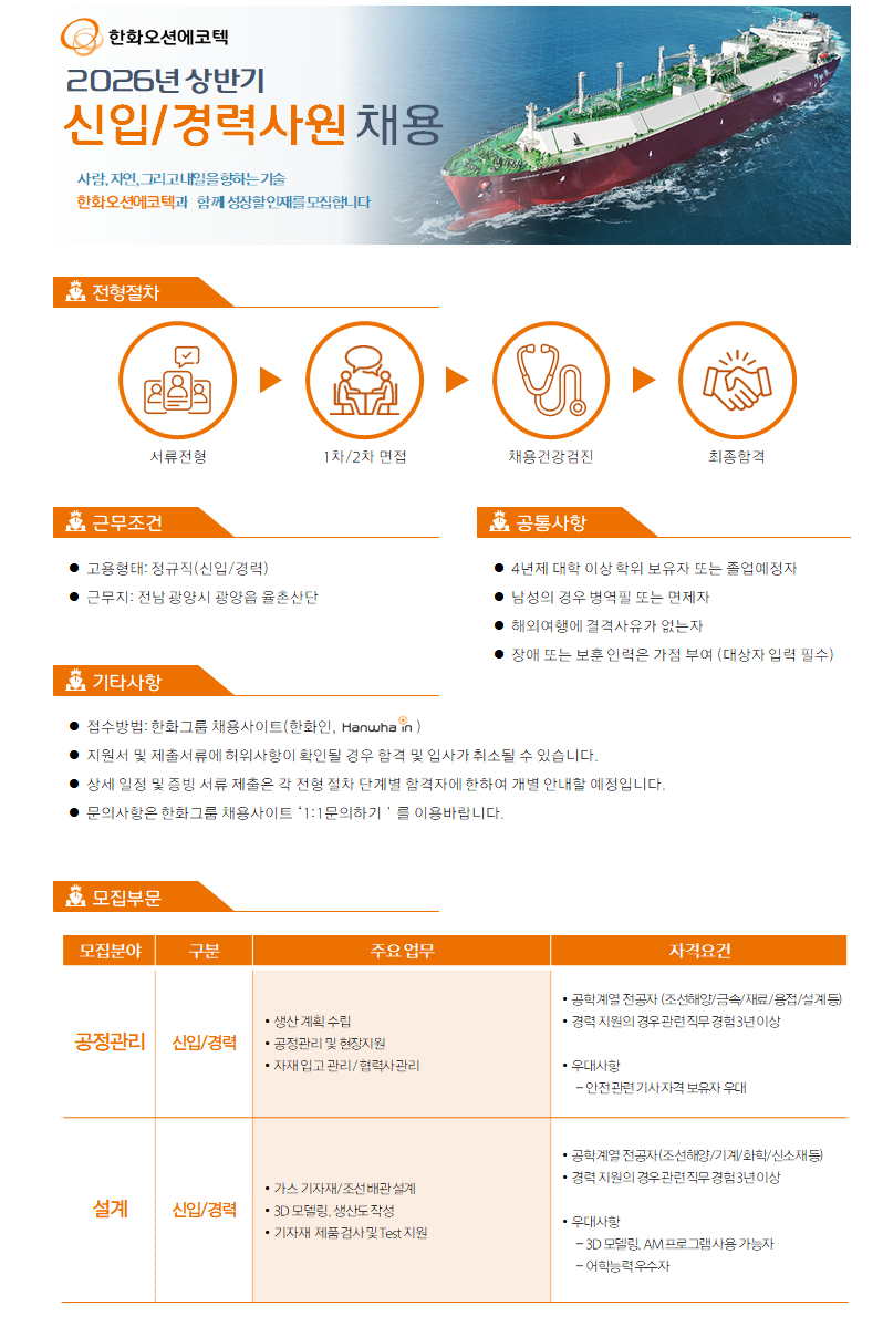 [한화오션에코텍] 2026년 상반기 신입/경력사원 채용