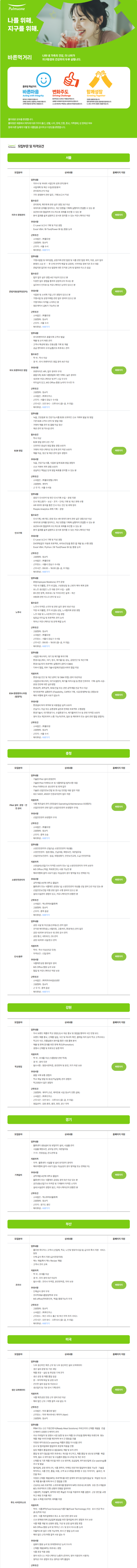 - 지원방법: 이력서를 메일로 송부, 각 부문별 홈페이지 참고 (https://pulmuone.career.greetinghr.com/ko/apply#85506e2b-0561-41ea-ac59-8c09c291cb62)