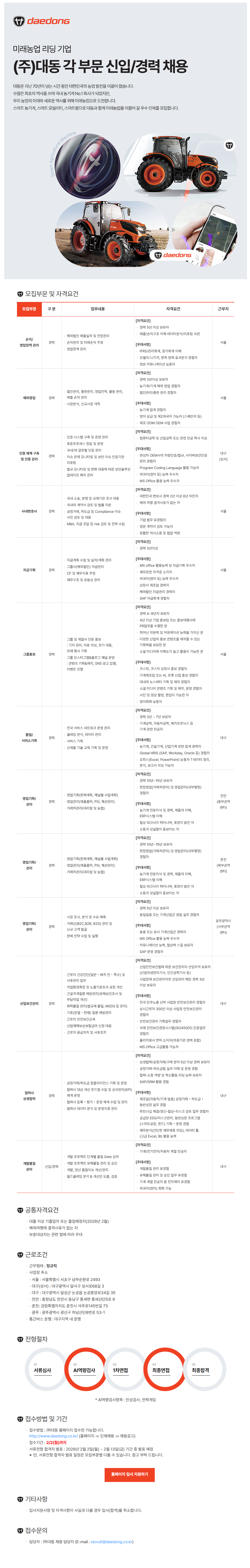 - 지원방법: 홈페이지를 통한 지원(https://daedong.recruiter.co.kr/app/jobnotice/view?systemKindCode=MRS2&jobnoticeSn=240537)