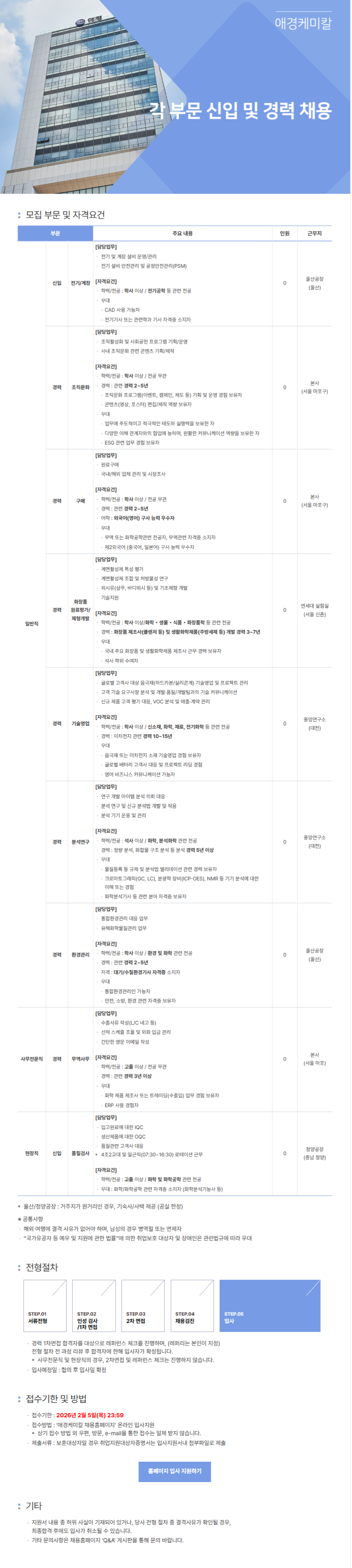 [애경케미칼] 각 부문 신입 및 경력 채용