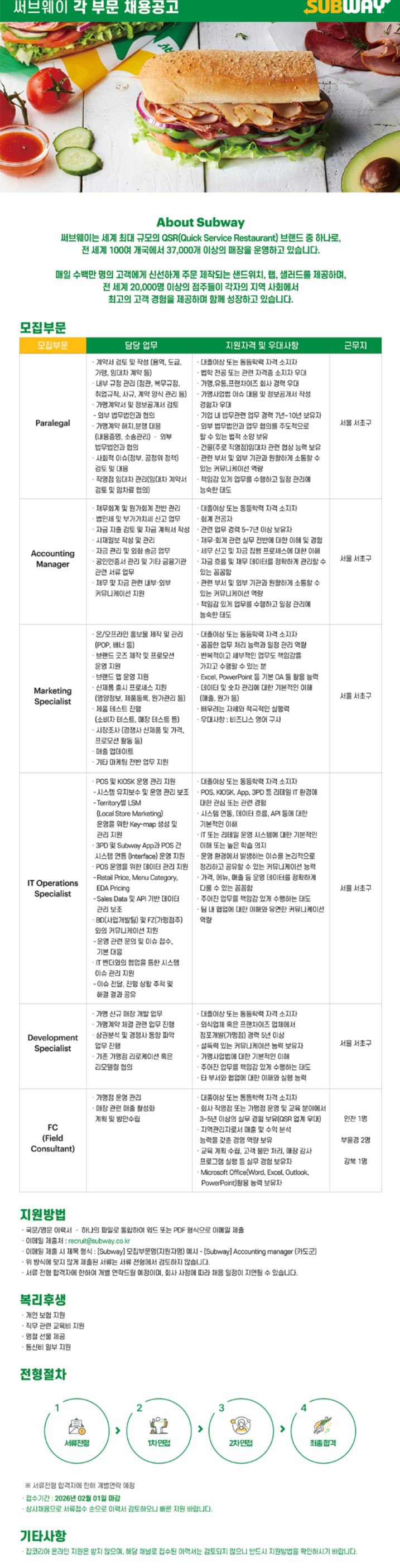 [써브웨이] 정규직 각 부문 채용공고
