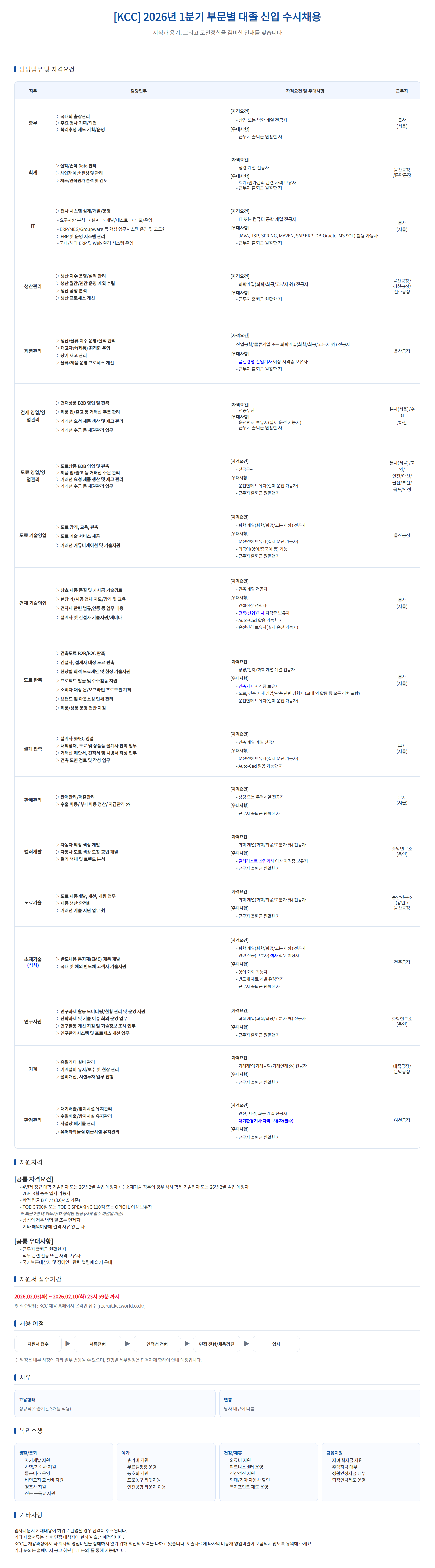 [KCC] 2026년 1분기 부문별 대졸 신입 수시채용