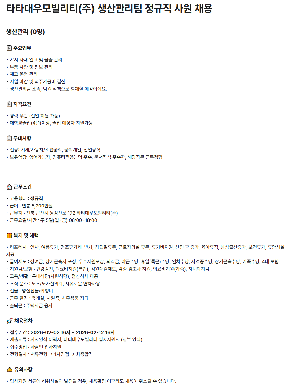 [타타대우모빌리티(주)] 생산관리팀 정규직 사원 채용