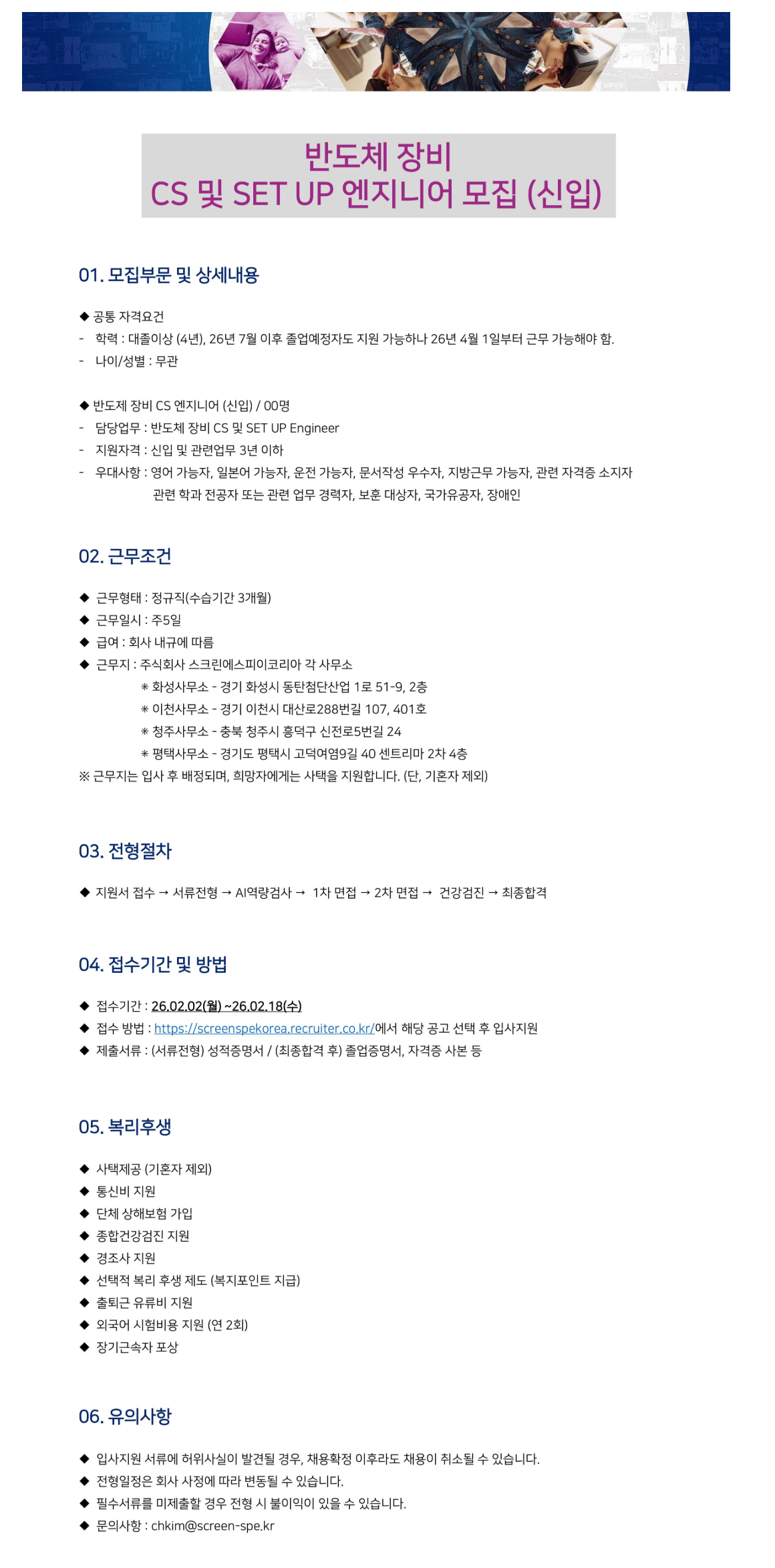 - 지원방법: 채용 홈페이지 온라인 입사지원(https://screenspekorea.recruiter.co.kr/app/jobnotice/view?systemKindCode=MRS2&jobnoticeSn=242753)