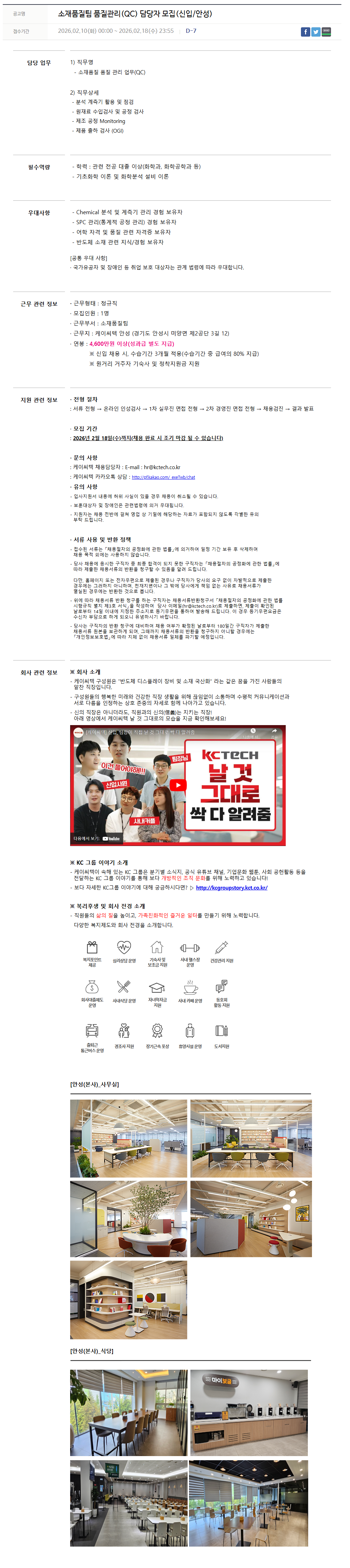 [케이씨테크] 소재품질팀 품질관리 (QC) 담당자 모집 (신입/안성)