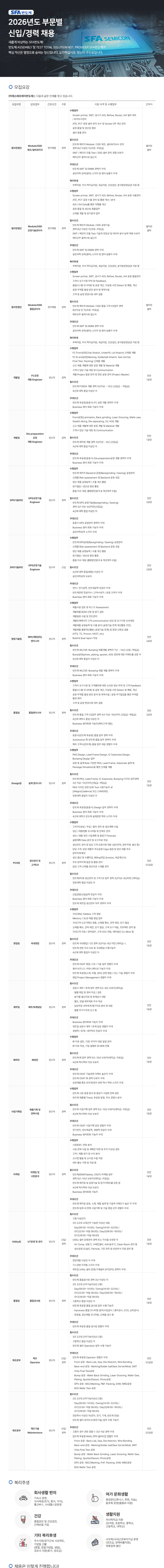 [SFA반도체(주)] 2026년도 부문별 신입/경력 채용