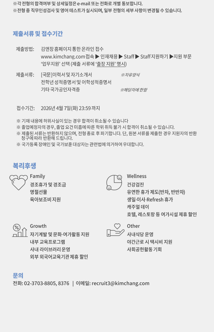 - 서류전형 > 1, 2차 면접 > 채용검진 > 최종합격