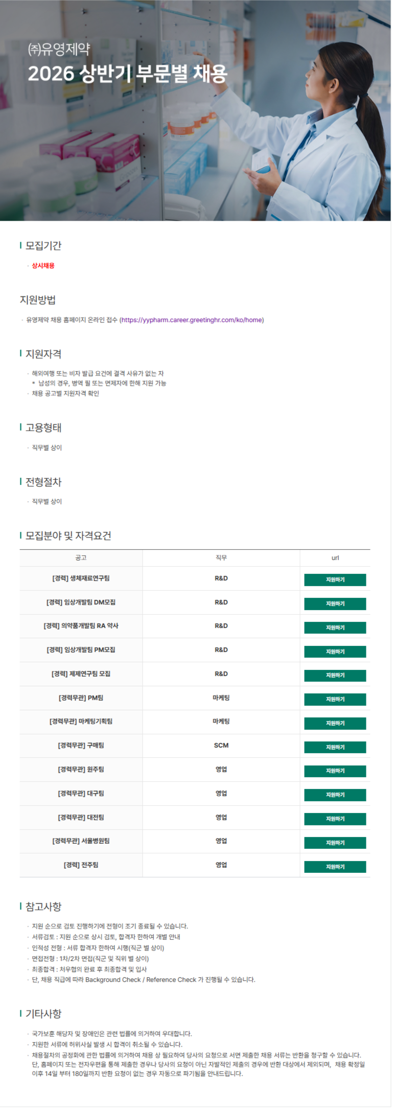 [(주)유영제약] 2026 상반기 부문별 채용