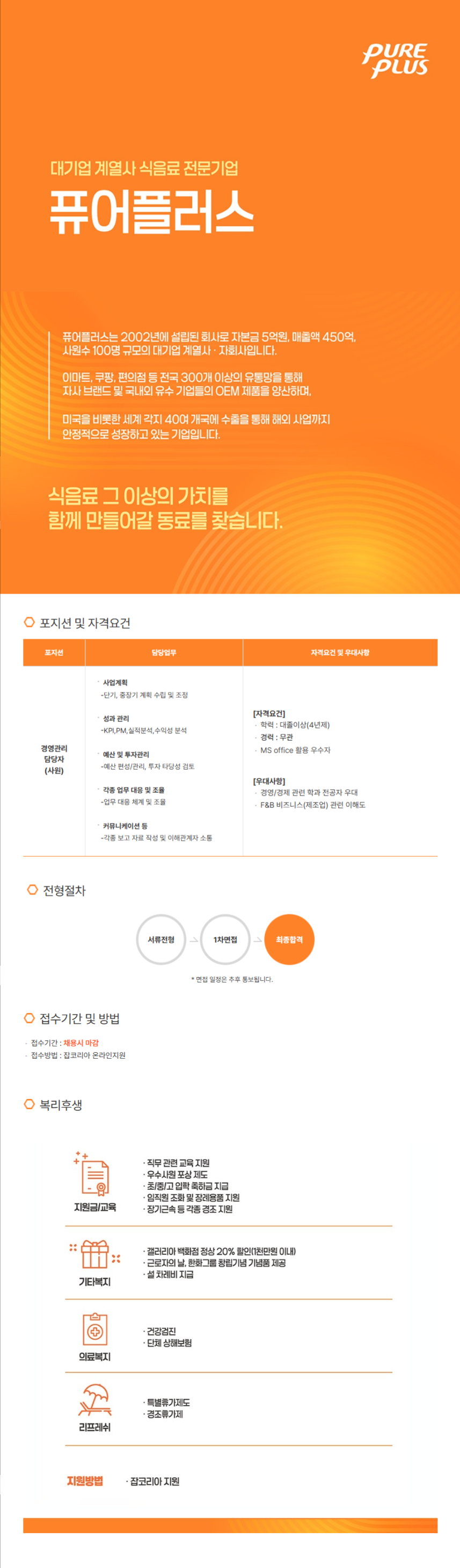 [퓨어플러스] 경영관리 담당자 모집